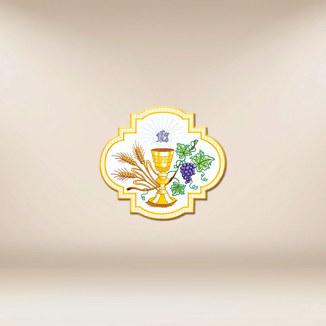 Applicazione ricamata comunione calice è stata progettata come un elegante e distintivo accento che richiama il mistero dell’Eucaristia. La combinazione dell’ostia con il monogramma IHS, del calice dorato, delle spighe e dei grappoli d’uva ricorda il dono del pane e del vino trasformati nel Corpo e Sangue di Cristo. L’applicazione ricamata comunione calice si adatta perfettamente a casule, stole, bandiere, tovaglie e tessuti preparati per le celebrazioni comunionali ed eucaristiche.