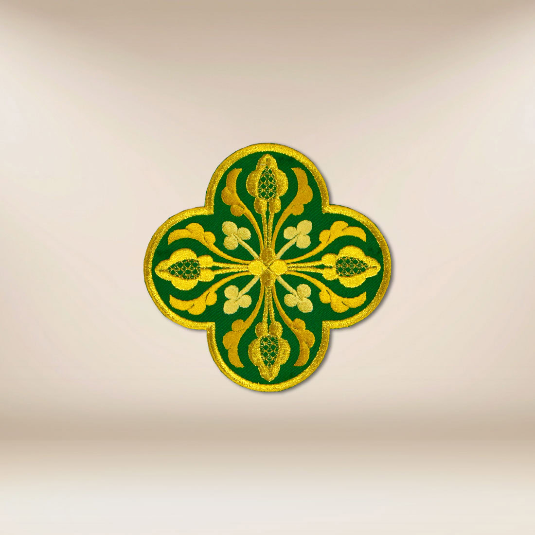 Per la realizzazione è stata utilizzata filo ricamato di alta qualità, che garantisce durata, finitura estetica e chiarezza del motivo. Ogni dettaglio è stato elaborato con attenzione alle proporzioni e alla leggibilità del simbolo, rendendo l’applicazione elegante sia da vicino che in uno spazio più ampio del presbiterio. La dimensione 13 × 13 cm la rende un’aggiunta universale, facile da abbinare a diversi elementi delle vesti.