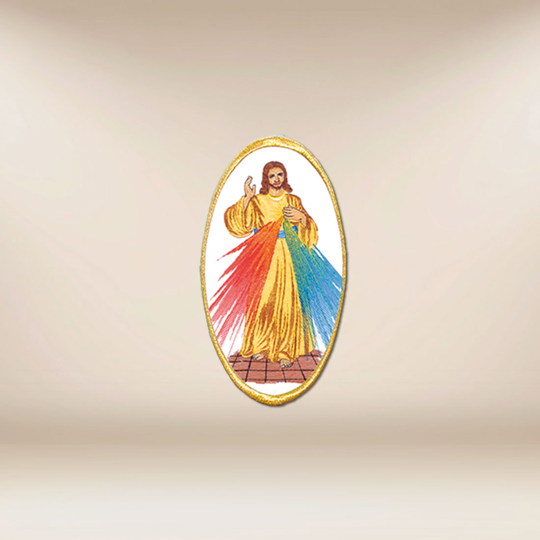 Applicazione ricamata con l’immagine di Gesù Misericordioso, destinata ad essere cucita su ornati e altre vesti liturgiche.