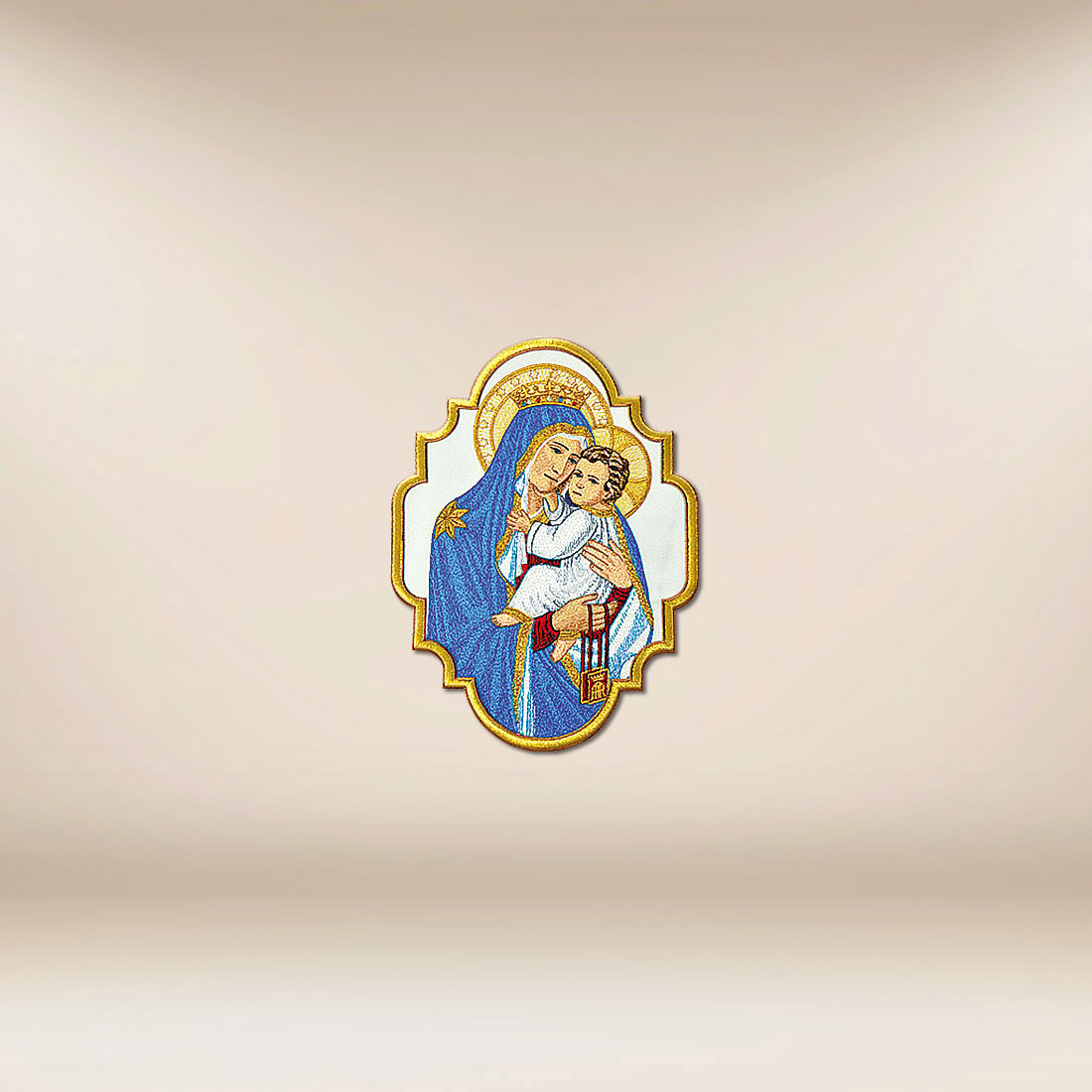 Applicazione ricamata Madonna con Bambino è stata progettata come una rappresentazione piena di calore e profondità teologica di una delle scene più importanti dell’iconografia cristiana. L’immagine di Maria che abbraccia il Bambino Gesù mostra non solo il Suo amore materno, ma anche il ruolo di Madre di Dio e Custode della Chiesa. Il gesto sottile dell’abbraccio e lo sguardo sereno della figura introducono nella liturgia un’atmosfera di silenzio, fiducia e sicurezza spirituale.