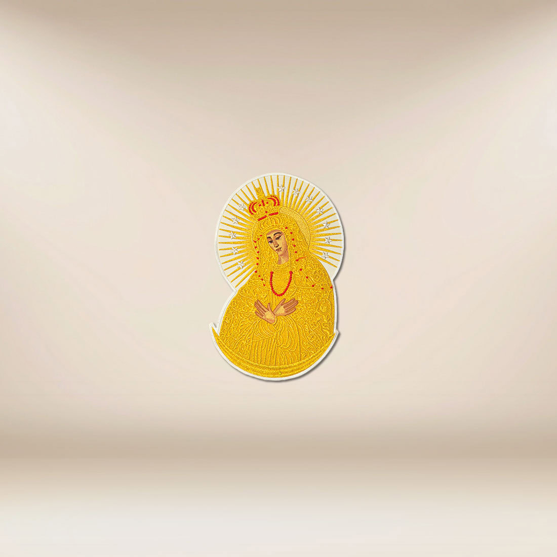 Applicazione ricamata Madonna di Ostrobrama è una rappresentazione unica di una delle immagini mariane più importanti nella tradizione della Chiesa. L’iconografia di Ostrobrama accompagna da secoli la preghiera, essendo segno di protezione, umiltà e totale affidamento alla volontà di Dio. L’immagine di Maria con le mani giunte e il capo chinato introduce nella liturgia un’atmosfera di silenzio, concentrazione e profonda spiritualità.