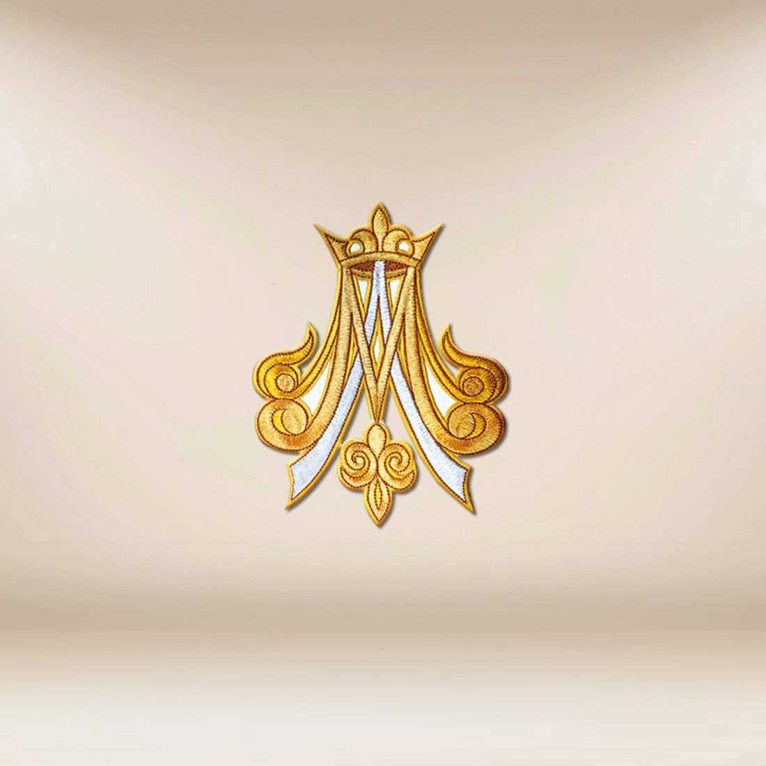 Applicazione ricamata Mariana è un motivo mariano classico e senza tempo, che da secoli occupa un posto speciale nell’arte sacra. Il monogramma “M” sormontato da una corona stilizzata e da linee decorative simboleggia la regalità di Maria, la Sua maternità e la protezione spirituale sulla Chiesa. La composizione è stata progettata in modo armonioso e leggibile, mantenendo la gravità e la dignità appropriate per lo spazio liturgico.