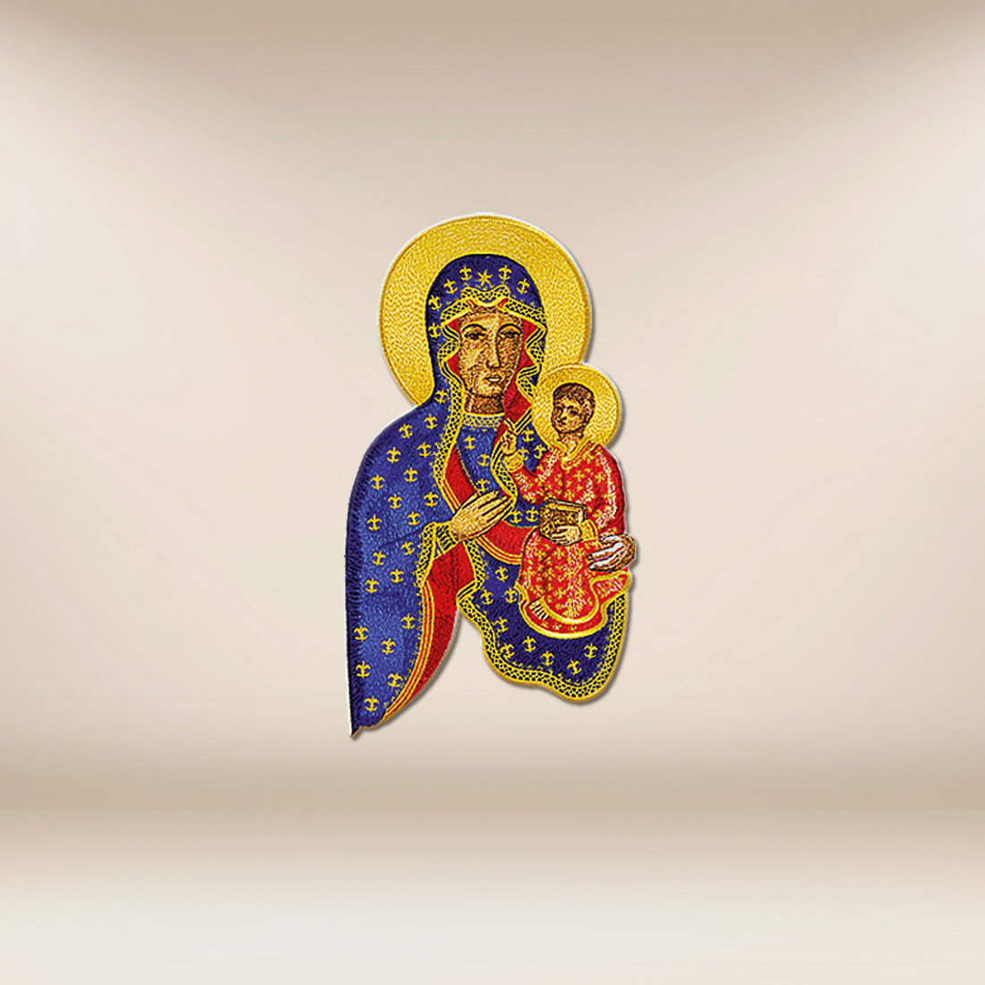 L’applicazione ricamata con l’immagine della Madonna di Częstochowa nelle dimensioni di 13cm x 22cm si riferisce a una delle rappresentazioni mariane più importanti e venerate nella tradizione della Chiesa. L’immagine iconografica di Jasna Góra, presente da secoli nella spiritualità dei fedeli, rappresenta un segno di affidamento, protezione e continua presenza di Maria nella vita della Chiesa.
