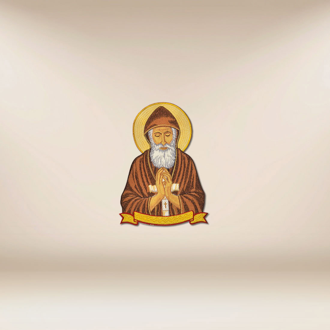 La simbologia della figura di S. Charbel richiama la sua vita eremitica, la totale fiducia in Dio e il suo particolare ruolo di intercessore nelle questioni spirituali e nelle preoccupazioni umane. La composizione serena del ricamo, i tratti distintivi del volto e i dettagli delicatamente elaborati degli abiti creano un’immagine piena di dignità e luce interiore. L’applicazione mantiene un carattere sacro, adatta sia per celebrazioni solenni che per la liturgia quotidiana.