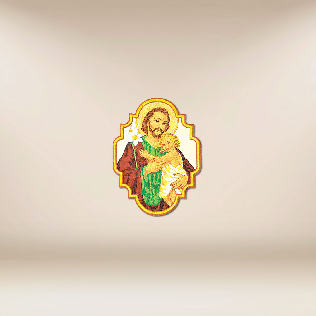 L’applicazione ricamata “S. Giuseppe” rappresenta il custode con il Bambino e il giglio, simboleggiando cura, purezza e fedeltà a Dio.