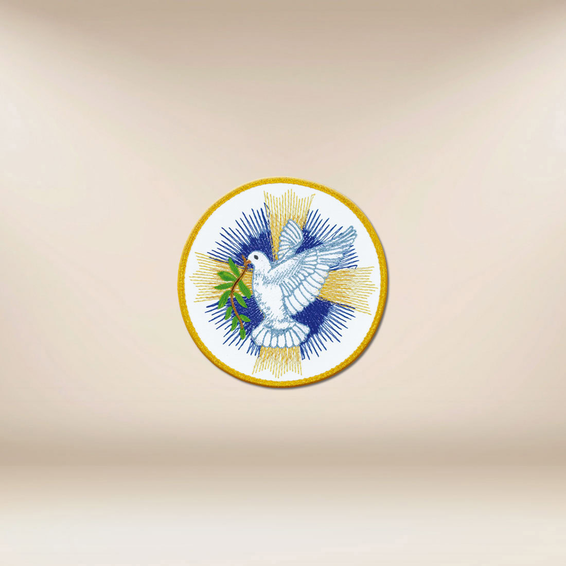 Il prodotto è realizzato con filati di alta qualità, il che garantisce durata, profondità estetica e chiarezza del ricamo. La precisa esecuzione del punto consente di rendere chiaramente i dettagli della figura della colomba e la composizione radiante dello sfondo. Dimensione 15 × 15 cm rende l’applicazione universale e facile da integrare armoniosamente in vari progetti di vesti liturgiche.