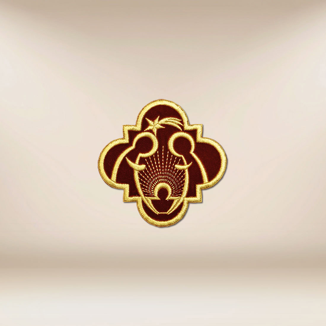 La base in peluche garantisce morbidezza e profondità di colore, mentre i fili dorati creano un disegno sottile ma espressivo. La decorazione rimane discreta, sottolineando magnificamente il significato del simbolo senza sovrastare l’intera composizione.