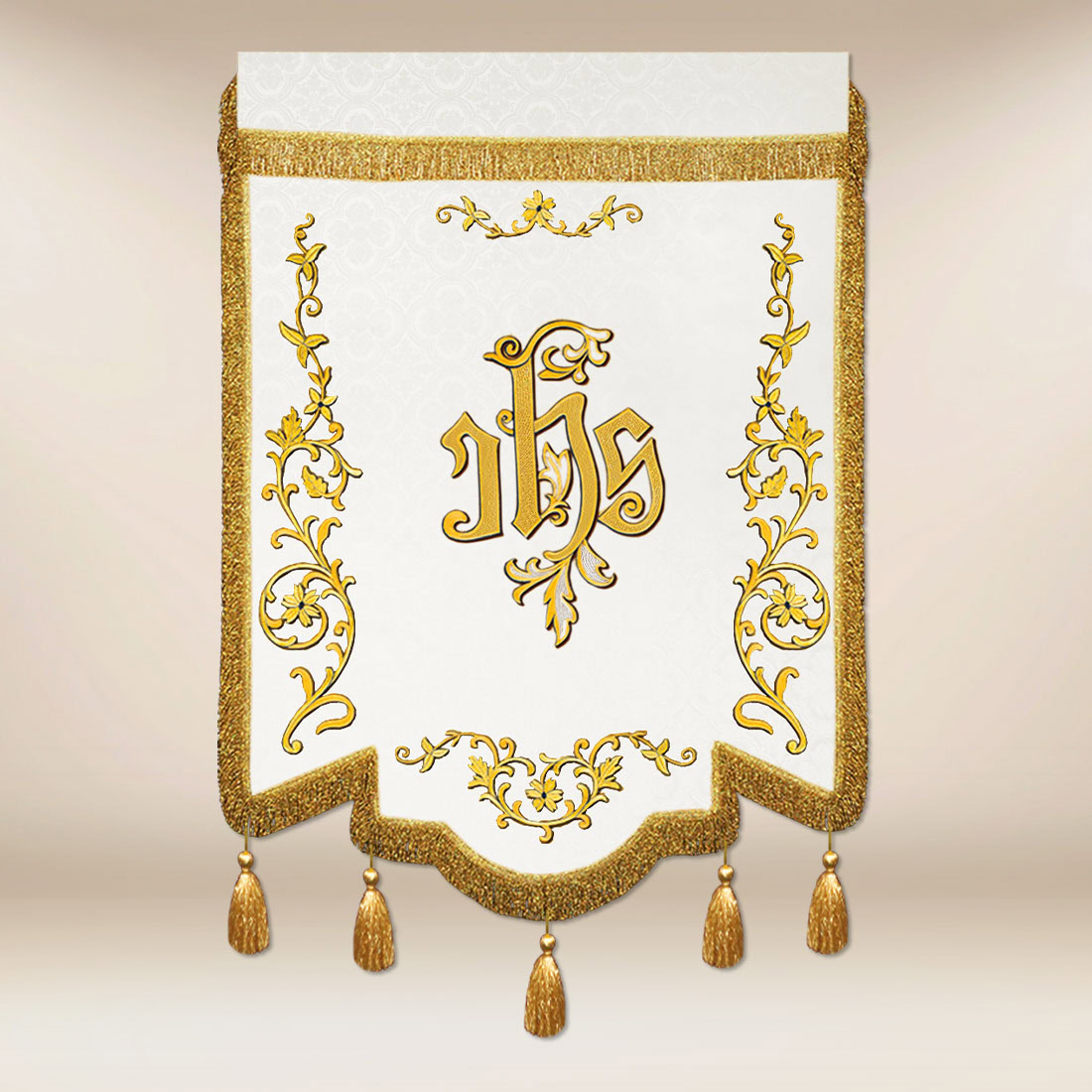 Il tessuto jacquard in colore ecrù garantisce durabilità, stabilità della forma e un aspetto nobile, mentre la finitura con passamaneria dorata e frange conferisce alla bandiera una dignità solenne — senza esagerazioni, mantenendo la sobrietà liturgica.