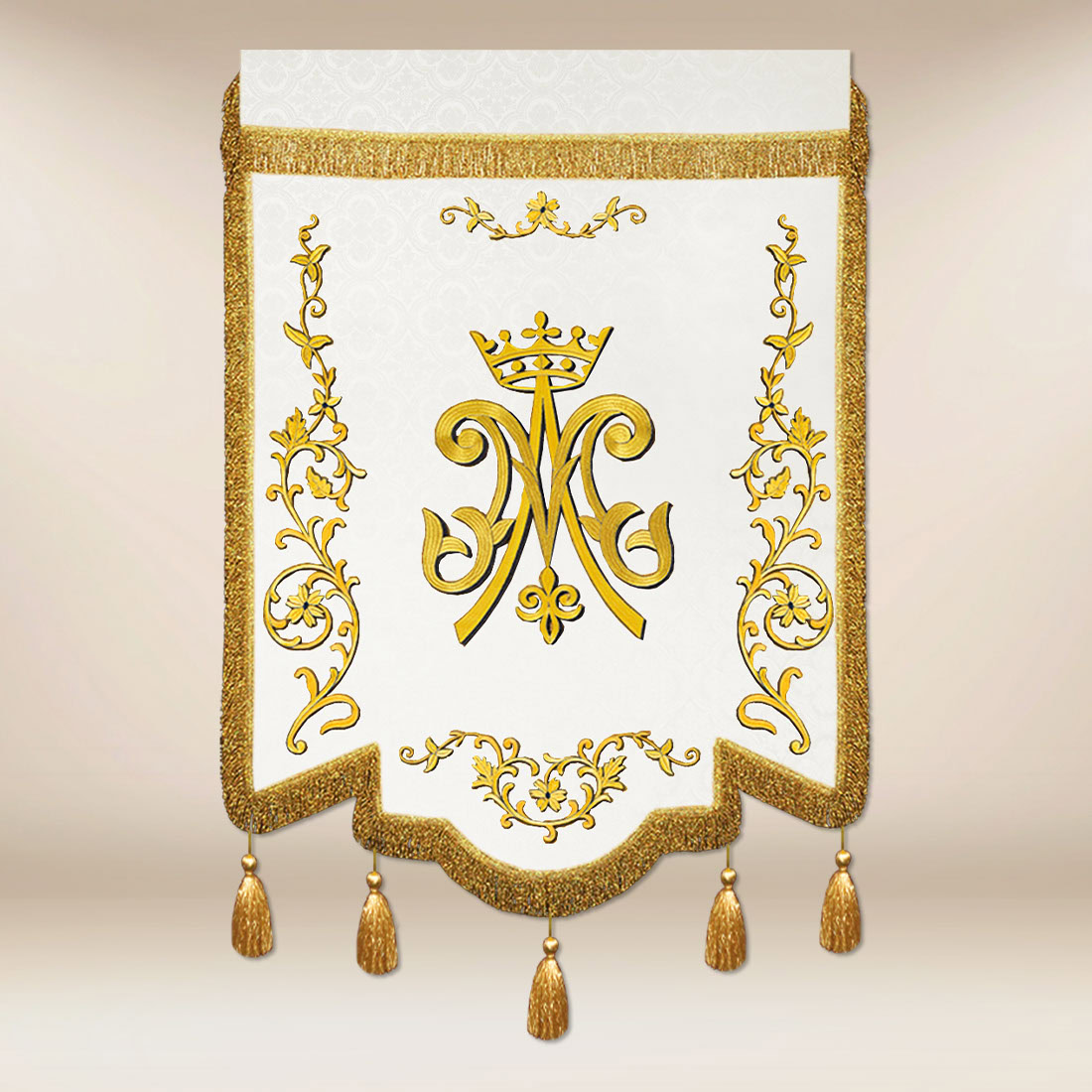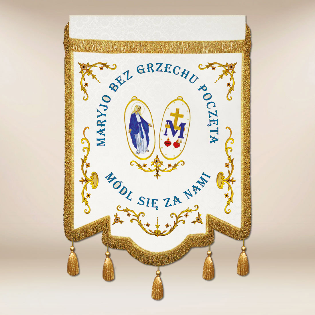 Il motivo centrale rappresenta Maria Concezione Immacolata, mostrata circondata da delicati ornamenti e da un invito alla preghiera. La simbologia dell’immagine ricorda la purezza del cuore, l’umiltà e la totale fiducia in Dio, così come l’intercessione continua di Maria nella vita quotidiana dei fedeli. Il retro della bandiera è decorato con un monogramma mariano ricamato con cura, che completa la composizione e ne rafforza il carattere liturgico e spirituale.