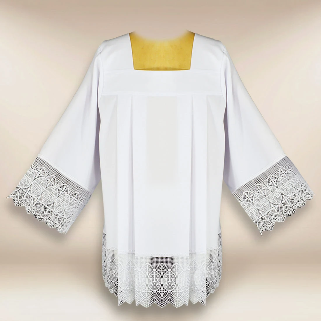 Elegante camice liturgico con gipiura “IHS” realizzato in leggera georgette, garantisce comfort e libertà di movimento durante la liturgia. Il motivo IHS posizionato nella delicata gipiura decora sia le maniche che la parte inferiore del camice, sottolineando il suo carattere sacro. La forma classica si adatta armoniosamente alla silhouette e si integra esteticamente con la soutane. È una proposta eccellente per ministranti, lettori e cerimonie di carattere solenne. Il camice è disponibile in diverse misure.