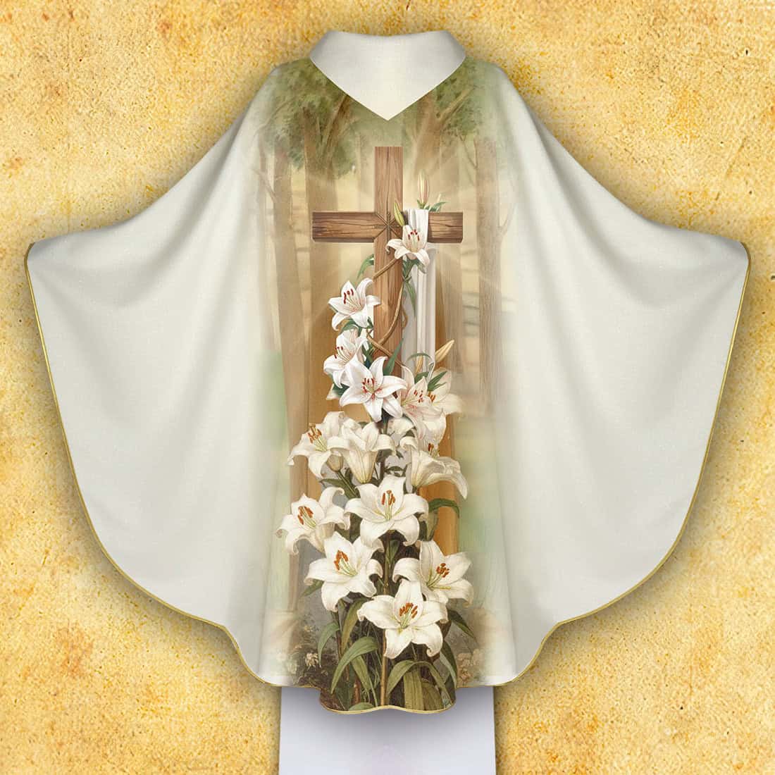 Lo sfondo della composizione e la presenza dei gigli simboleggiano la purezza, la dedizione e l’umiltà, sottolineando al contempo il carattere solenne della veste. L’insieme è armonioso, sottile e mantenuto in una calda palette di colori naturali, che si armonizza bene con l’illuminazione del presbiterio e gli interni delle chiese.