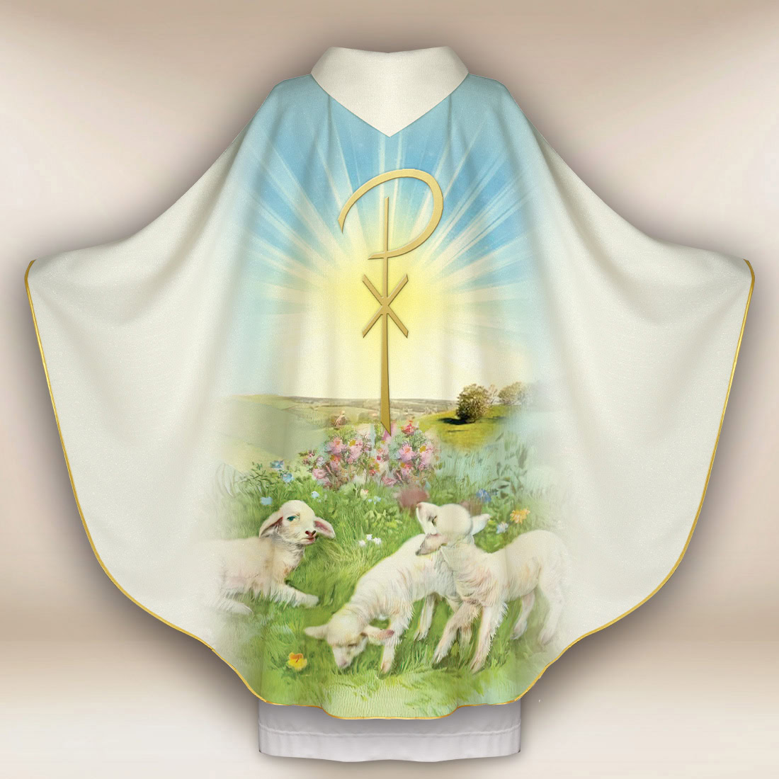 Casula foto Gesù Risorto è un paramento liturgico creato per le celebrazioni della Pasqua, della Resurrezione e delle Messe Pasquali. Il motivo centrale mostra il maestoso Gesù Risorto, che tiene in mano il vessillo pasquale – segno di vittoria sulla morte. Sul retro si trovano Agnelli, simbolo di redenzione e pace, che conferisce all’intera composizione una delicata dimensione teologica.