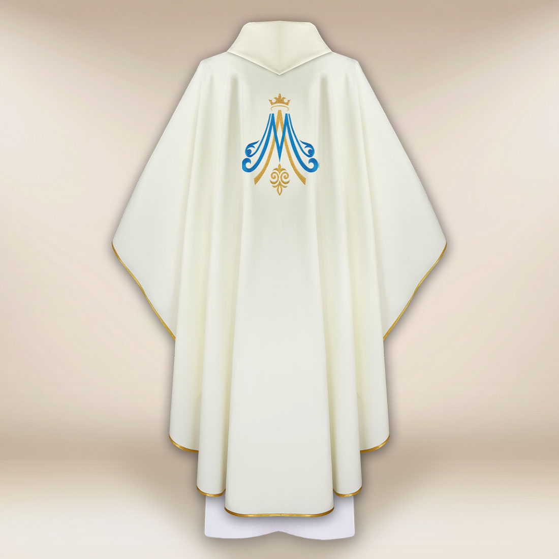 Il retro della casula è decorato con un monogramma mariano stilizzato “M” sormontato da una corona — simbolo della dignità regale della Madonna e della Sua protezione spirituale sui fedeli. La cucitura precisa e le finiture eleganti sottolineano il rango liturgico della veste, conferendole un carattere senza tempo adatto sia per le festività solenni che per le celebrazioni di carattere mariano durante l’anno liturgico.