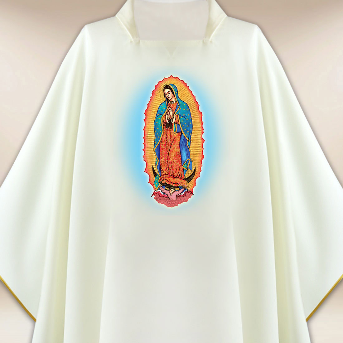 L’elemento centrale della parte anteriore della casula è l’immagine della Madonna di Guadalupe, presentata in una composizione ricca di simbolismo, conosciuta e riconoscibile in tutta la Chiesa. Grazie all’uso della tecnica di sublimazione fotografica, l’immagine mantiene l’intensità dei colori, le delicate transizioni tonali e un’alta durabilità. I dettagli della rappresentazione rimangono chiari e armoniosi anche con un uso regolare, e l’insieme crea una composizione sacra coesa e serena, favorevole alla concentrazione nella preghiera.