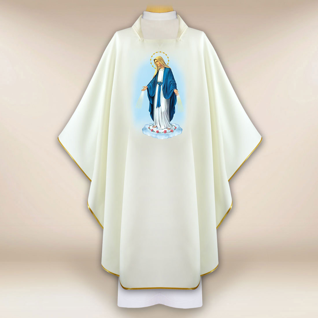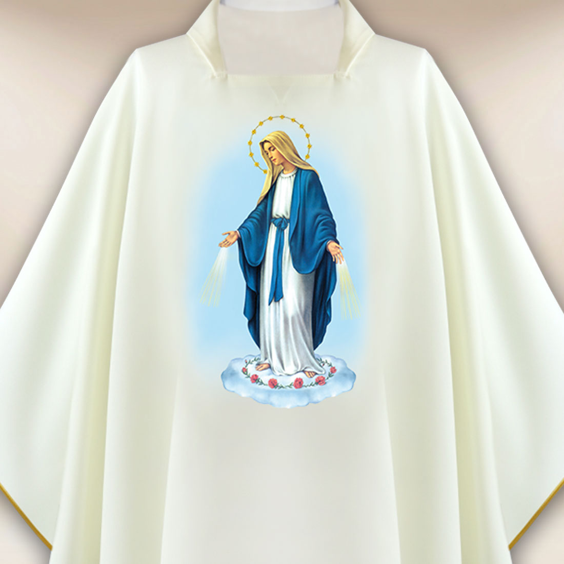 Casula con immagine della Madonna Immacolata realizzata in tessuto leggero e morbido di alta qualità, che si adatta fluidamente e garantisce comfort durante la celebrazione.