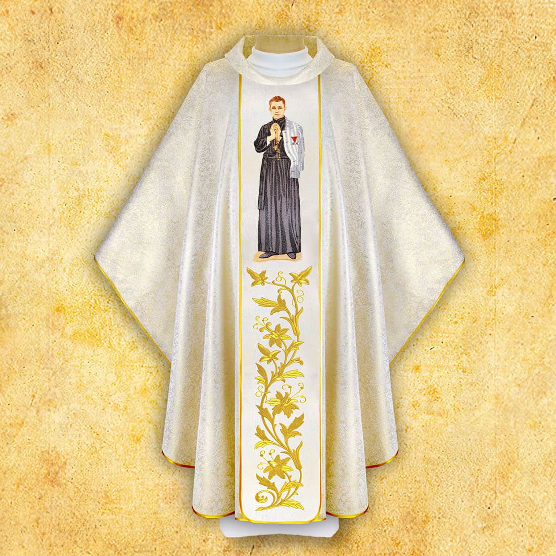 Urbanowicz Haft Polska presenta la casula ricamata B. Frelichowski, progettata per le celebrazioni liturgiche che commemorano la vita, il martirio e il servizio del patrono degli scout, dei prigionieri e dei giovani. Il vestimento è realizzato in elegante tessuto di tipo Złoto Papieskie in un delicato colore ecru, che si illumina di un filo dorato durante la celebrazione. La leggerezza e la morbidezza del materiale fanno sì che la casula si adatti naturalmente, sottolineando il carattere solenne della liturgia.