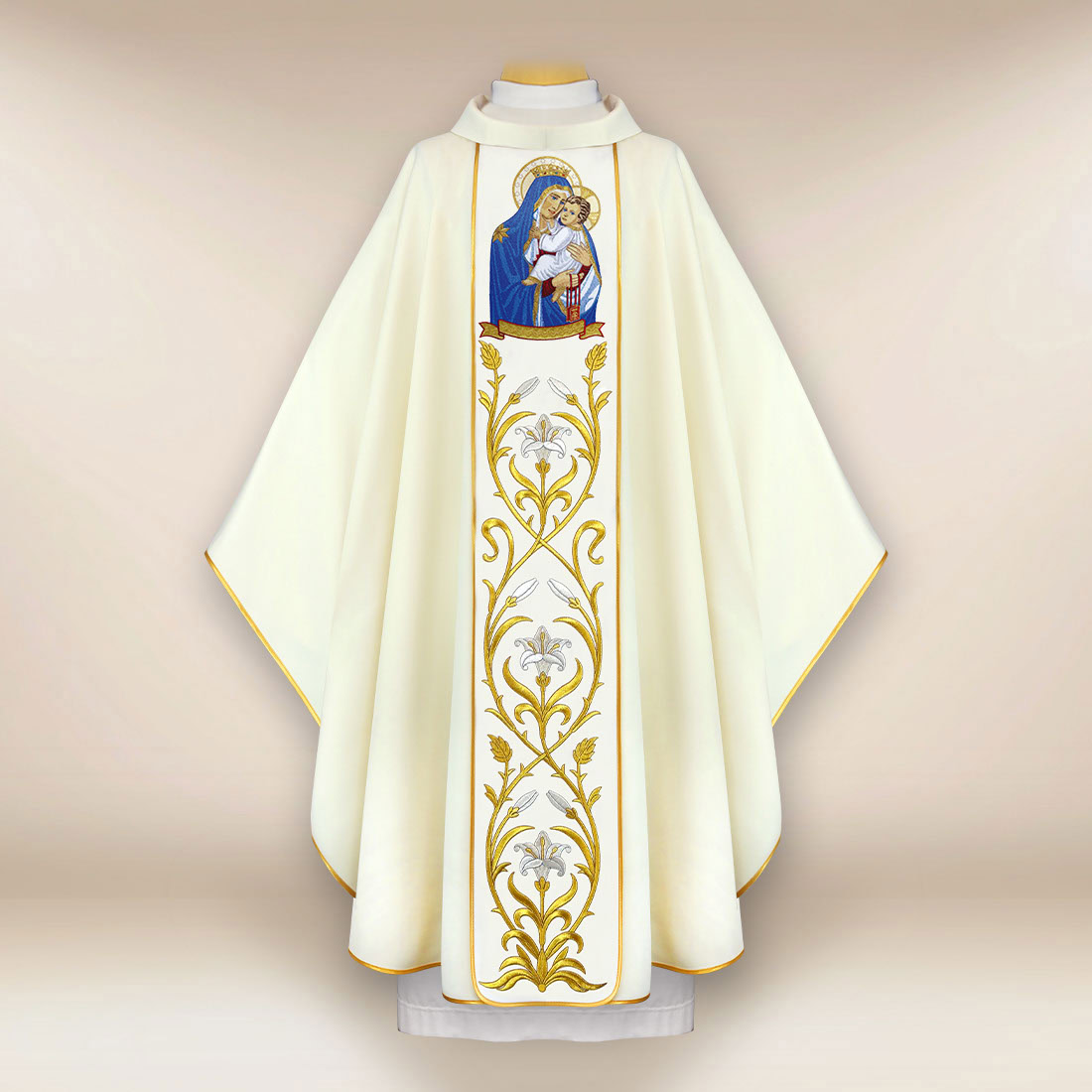 Elegante casula mariana ispirata al culto della Madonna del Carmelo, realizzata in tessuto morbido e leggero in tonalità ecru intrecciato con filo dorato.