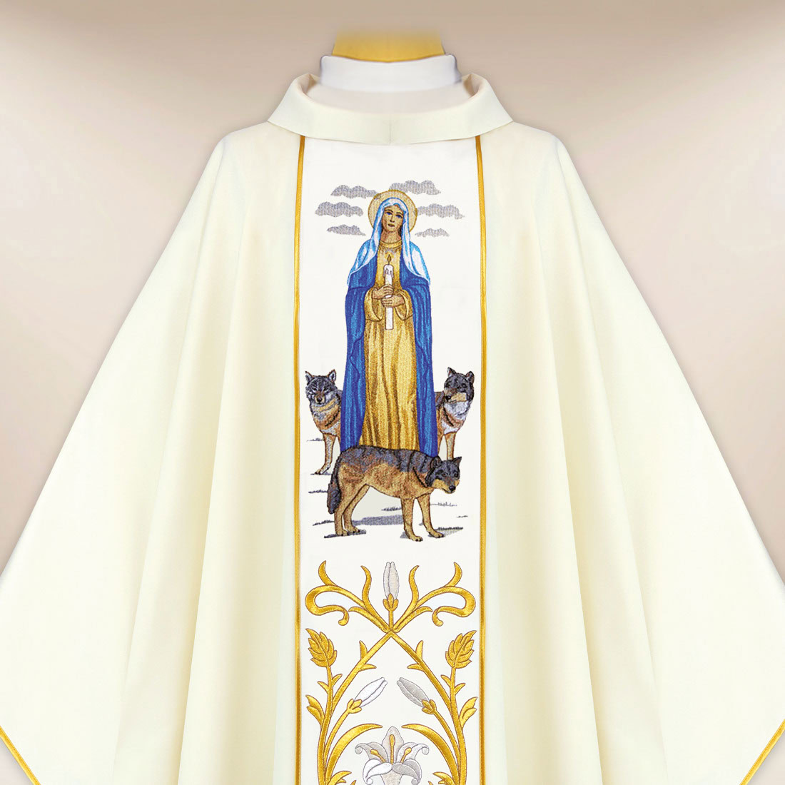Il motivo mariano centrale conserva la gravità liturgica e introduce la simbologia della Madonna della Candelora – Protettore e Intercessore, il cui culto è particolarmente presente nella tradizione polacca. Casula ricamata Madonna della Candelora si inserisce in questa dimensione di spiritualità, aggiungendo solennità e profondità alla celebrazione.