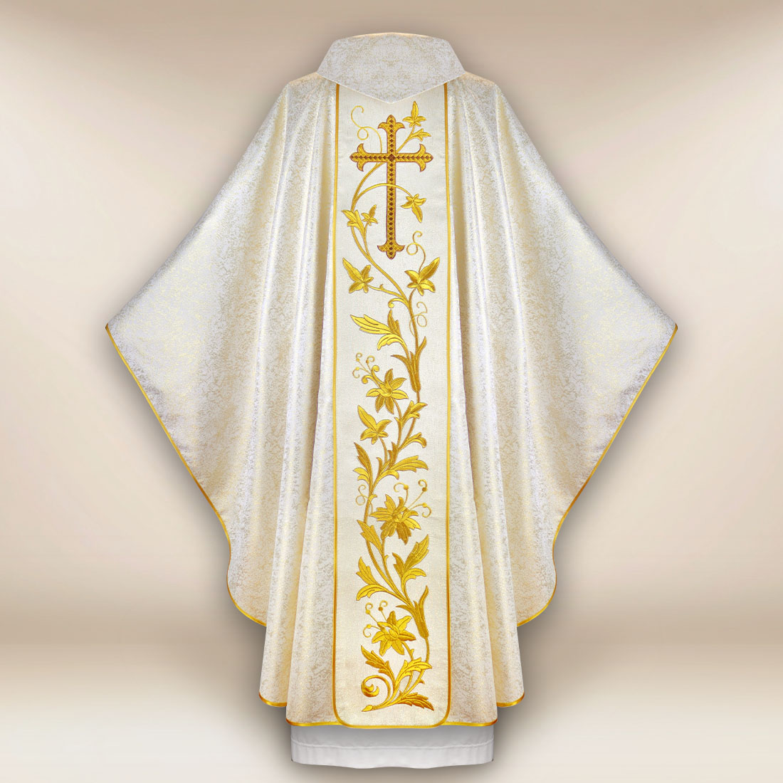 Il passante centrale ricamato in color ecru, elegantemente intrecciato con filo dorato, è stato realizzato con particolare attenzione ai dettagli. L’ornamento è equilibrato e liturgicamente armonioso, creando una composizione sacra e serena. L’elaborazione del motivo in modo sottile ed elegante consente alla simbologia Mariana di risaltare chiaramente, rimanendo al contempo in piena armonia con il carattere liturgico della veste.