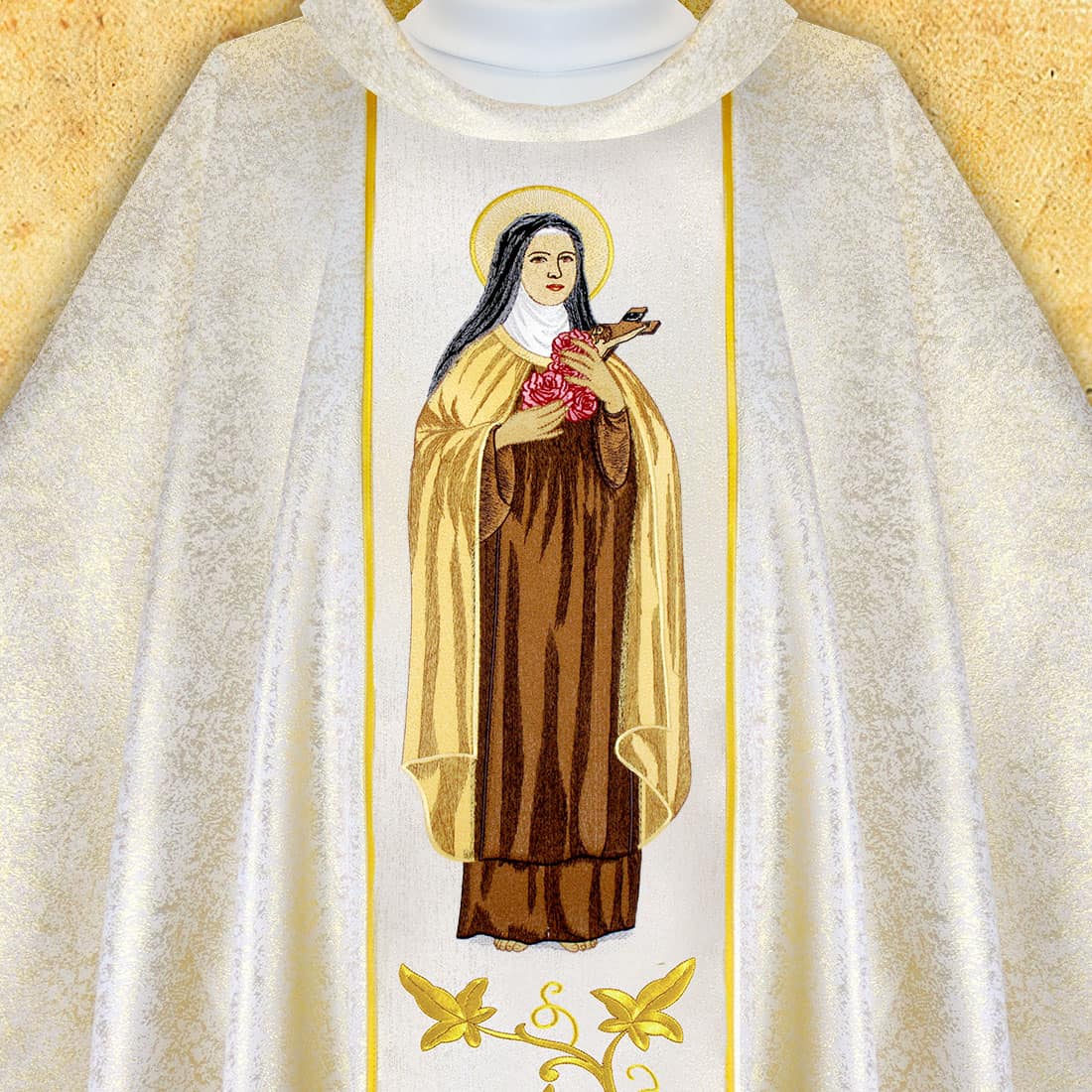 Lungo tutta la lunghezza della veste corre una fascia ricamata in tonalità ecru, delicatamente intrecciata con filo dorato. Questo ornamento conferisce alla casula un carattere solenne e al contempo dolce, che armonizza con l’immagine della santa. I motivi floreali simboleggiano la bellezza spirituale, la semplicità e la tenerezza – caratteristiche che S. Teresa ha portato nella vita della Chiesa.