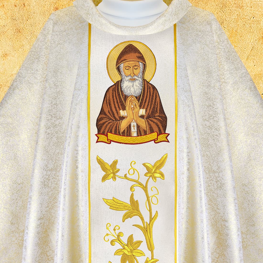 L’immagine di San Charbel, monaco e eremita del Libano, porta con sé un messaggio di preghiera, umiltà e profonda spiritualità. La simbologia risuona non solo nella rappresentazione, ma anche nella composizione dell’intera veste, rendendo questa proposta particolare per coloro che desiderano sottolineare la dimensione mistica e contemplativa della liturgia. Così concepita, Casula ricamata San Charbel diventa non solo un elemento dell’abito, ma anche un significativo segno di un messaggio spirituale.