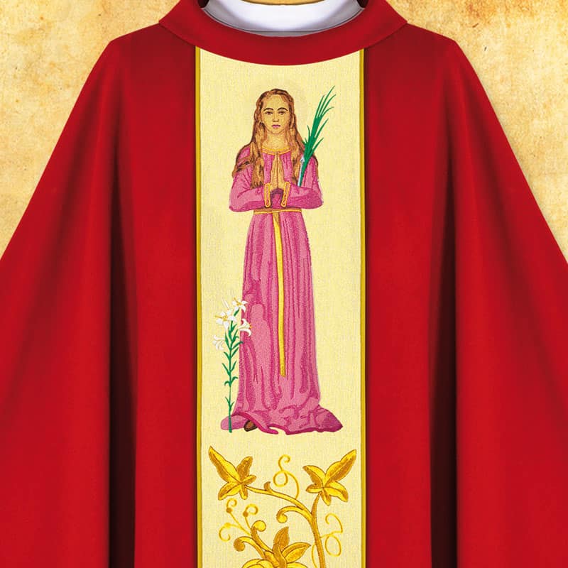 Casula ricamata San Filomena è un paramento liturgico che unisce l’eleganza della realizzazione con una simbolica spirituale unica. Nella parte centrale della fascia si trova un ricamo finemente eseguito, che rappresenta Santa Filomena – giovane martire, apprezzata nella Chiesa per la sua innocenza, fedeltà e la speranza che scaturisce dalla fede. La sua immagine, presentata in iconografia classica, è stata curata nei dettagli, rendendo il paramento perfettamente in sintonia con l’atmosfera liturgica e introducendo nella celebrazione una profondità di preghiera.