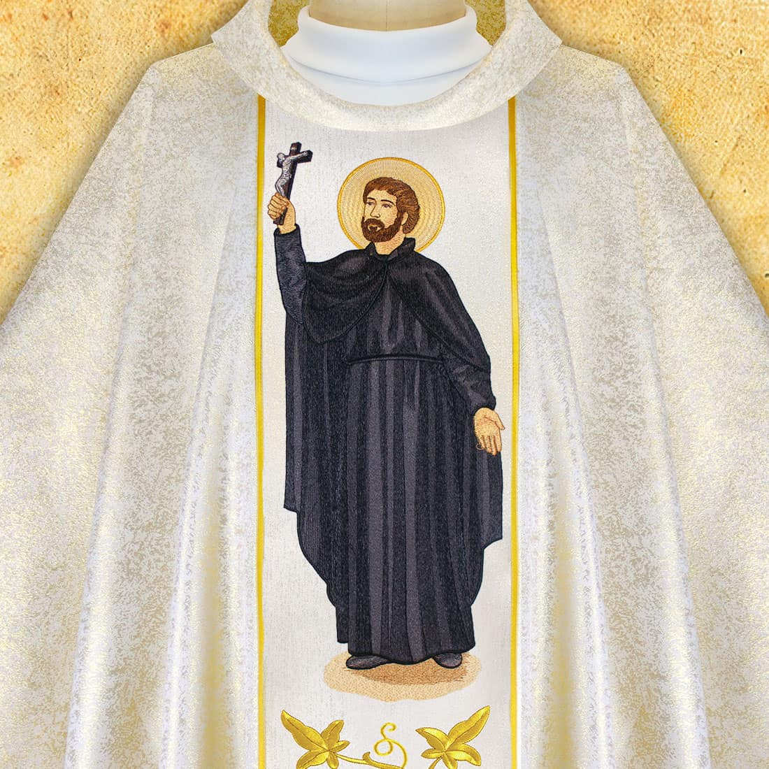 Lungo la casula corre una elegante fascia in tonalità ecru, intrecciata con filo dorato. Il sottile ornamento conferisce armonia e leggerezza alla composizione, armonizzandosi perfettamente con la rappresentazione centrale del santo. Sul retro della veste si trova una croce ricamata mantenuta nella stessa stilistica, sottolineando l’unità e la simmetria del progetto.
