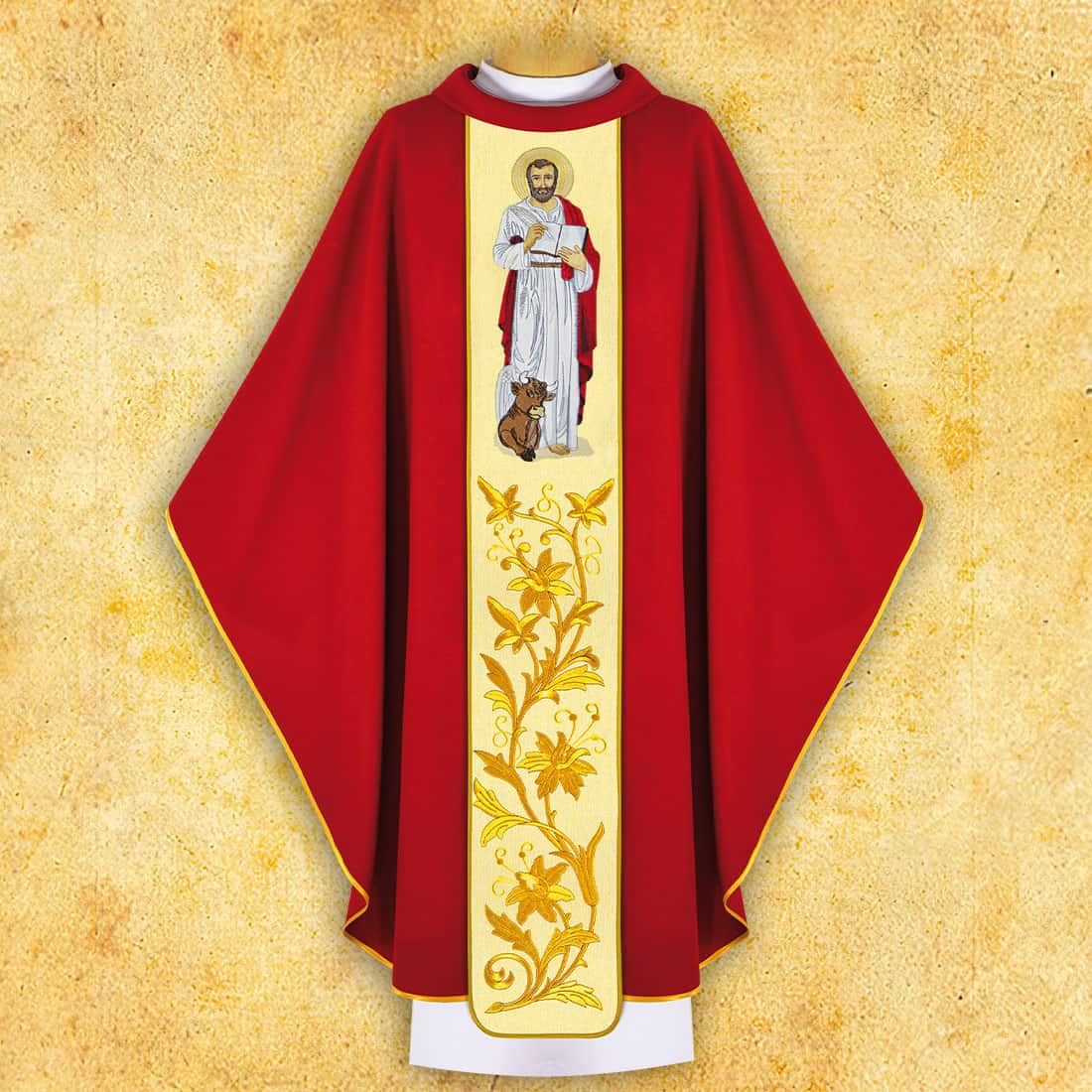Elegante casula rossa con immagine ricamata di San Luca e simbolo del bue.