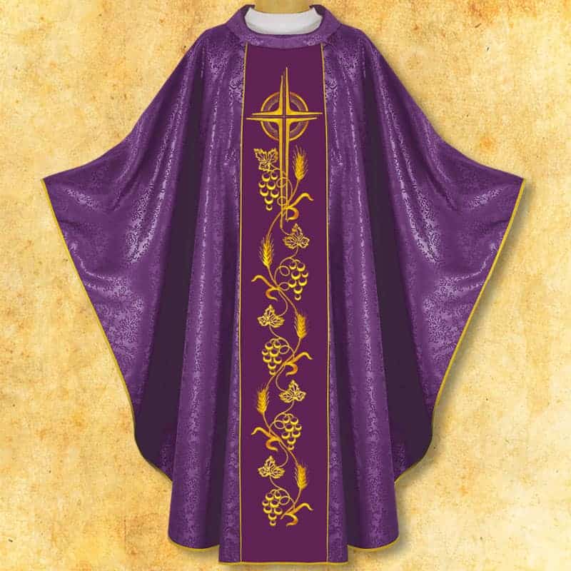 Casula viola con orphrey ricamato è una proposta per i sacerdoti che desiderano sottolineare l’atmosfera di raccoglimento, silenzio e attesa spirituale. Il viola simboleggia da secoli la penitenza e la preparazione, pertanto la veste si adatta perfettamente al periodo dell’Avvento e della Quaresima. Il ricamo centrale che rappresenta la croce, i grappoli d’uva e le spighe di grano crea un chiaro segno eucaristico, inserendosi al contempo nei canoni tradizionali dell’arte sacra.