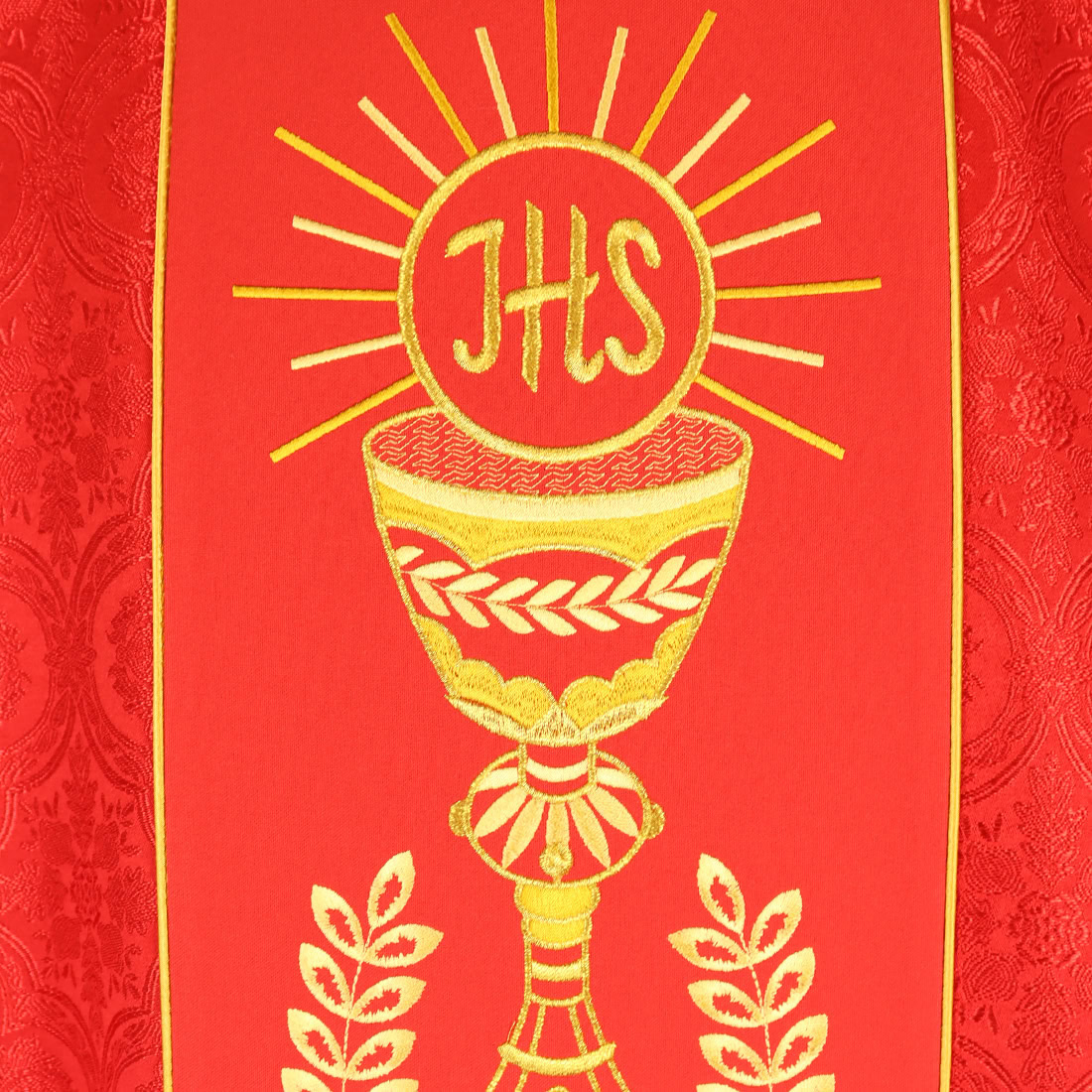 Casula con orphrey ricamato è realizzata in elegante tessuto jacquard con finitura satinata, che conferisce alla veste un delicato splendore e una straordinaria morbidezza. Il materiale si adatta armoniosamente, creando una linea dignitosa adatta a celebrazioni solenni e liturgie festive, in cui il colore rosso sottolinea la simbologia dello Spirito Santo e del martirio.