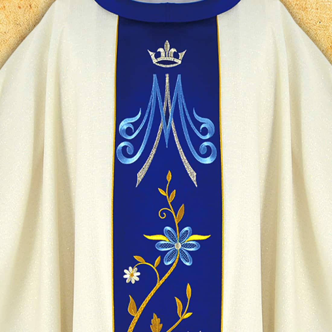 Il modello si distingue per il ricamo mariano sull’orpheo e colletto di colore blu, che si armonizza perfettamente con il tutto. Il ricamo sul retro, come è consuetudine per la casula con ricamo mariano, è identico a quello sul davanti, conferendo alla casula una simmetria ed eleganza uniche. In dotazione c’è una stola interna coordinata, realizzata con lo stesso materiale.