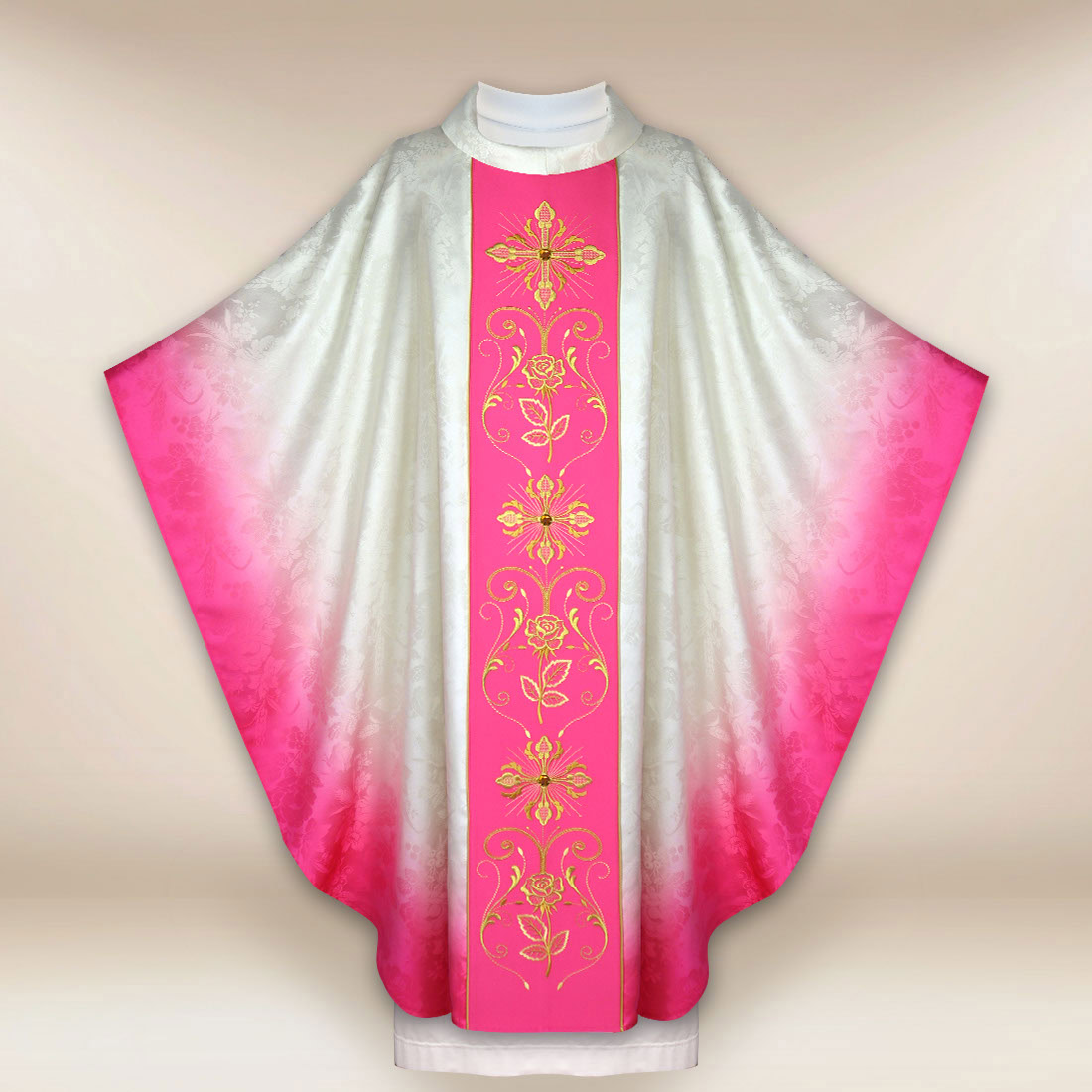 Casula liturgica rosa moderna è un vestimento creato pensando alla particolare simbologia della III Domenica di Avvento e della IV Domenica di Quaresima, quando la liturgia invita a vivere la gioia nel tempo di penitenza. Il colore rosa rappresenta in questi giorni un segno di luce, speranza e sollievo spirituale, e la casula nella sua composizione esprime pienamente questa profondità teologica.