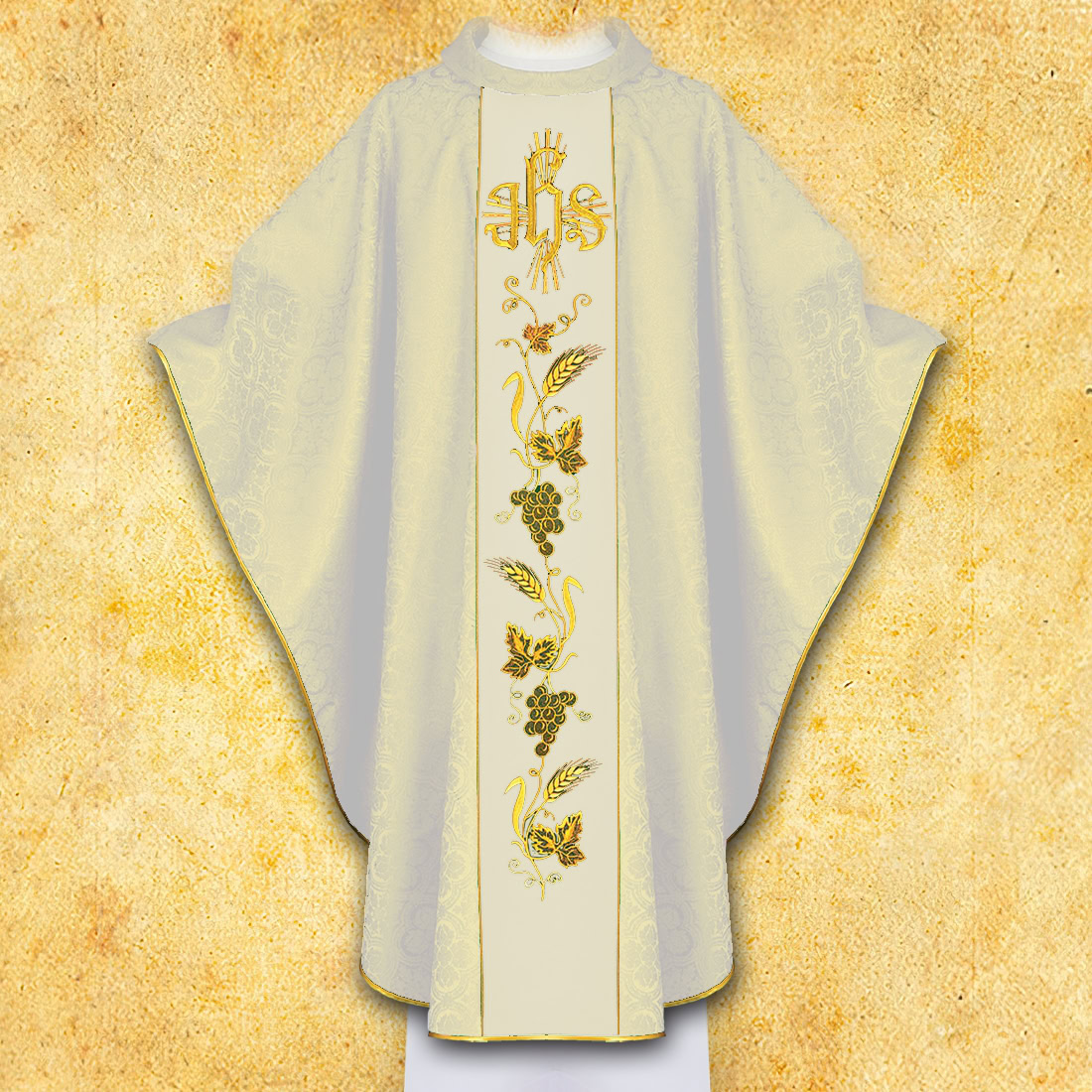 Il punto centrale della veste è il passe ricamato liturgico, su cui è posto il simbolo IHS, grappoli d’uva e spighe di grano – motivi fortemente legati all’Eucaristia e al Sacrificio di Cristo. I ricami precisi realizzati in una palette di colori coerente conferiscono alla veste profondità e armonia. Un passem identico sul retro della casula sottolinea l’equilibrio della composizione e l’eleganza dell’intero progetto.