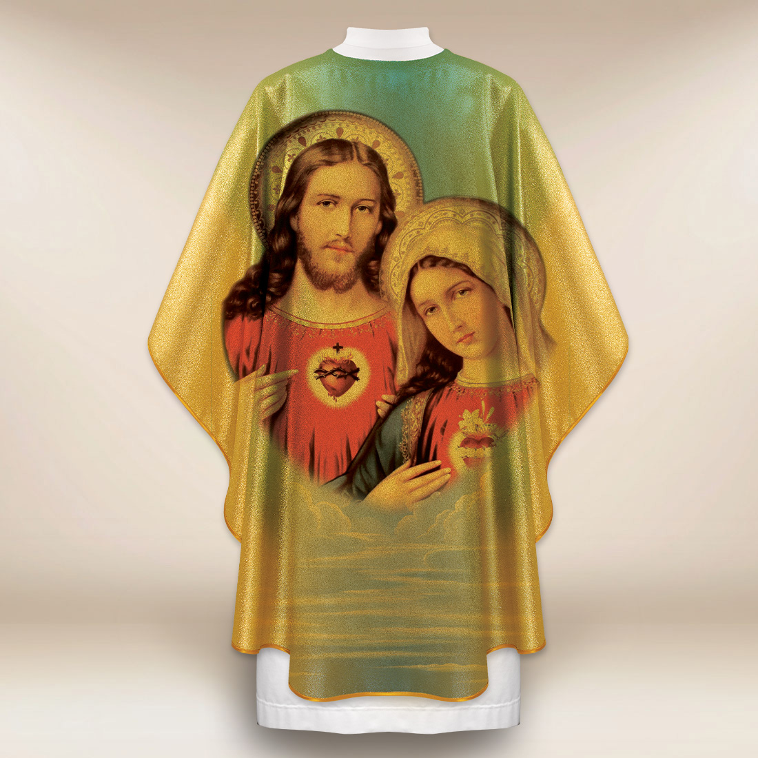 Casula dorata con immagine Cuore di Gesù e Cuore di Maria è una combinazione armoniosa di simbolismo tradizionale e realizzazione moderna, costituendo una degna cornice per i momenti più importanti della liturgia.