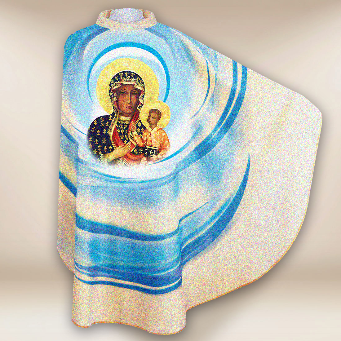 Casula con l’immagine di Madonna di Częstochowa è un’eccezionale veste liturgica che unisce una profonda simbologia mariana, un’elevata estetica di realizzazione e la durabilità dei materiali. La casula è stata progettata pensando alle celebrazioni ecclesiali solenni, alle festività mariane e agli eventi di particolare significato spirituale e nazionale. L’elemento centrale della composizione è l’immagine della Madonna di Częstochowa con il Bambino Gesù – icona situata nella cappella di Jasna Góra a Częstochowa, il santuario mariano più importante in Polonia.