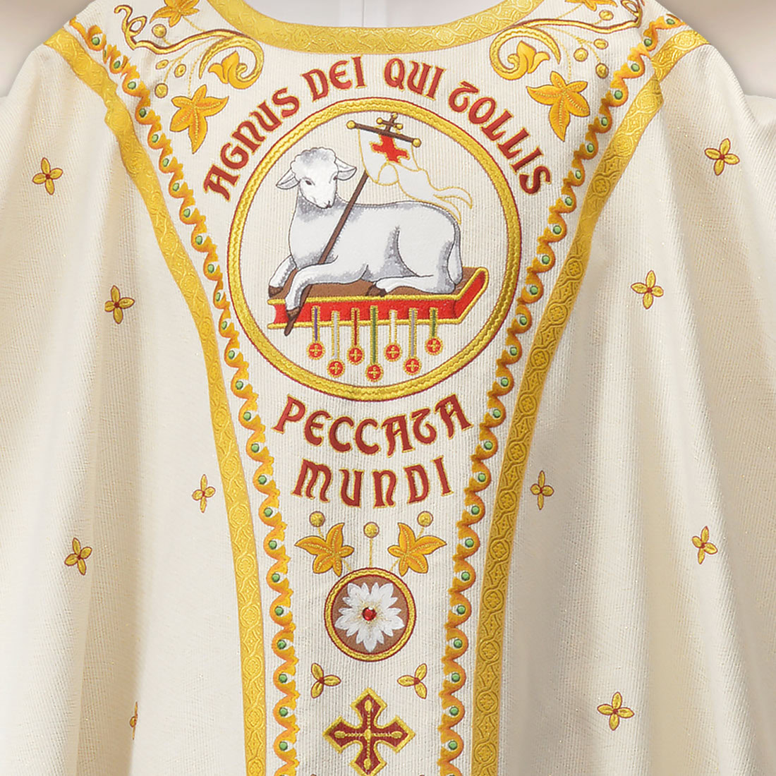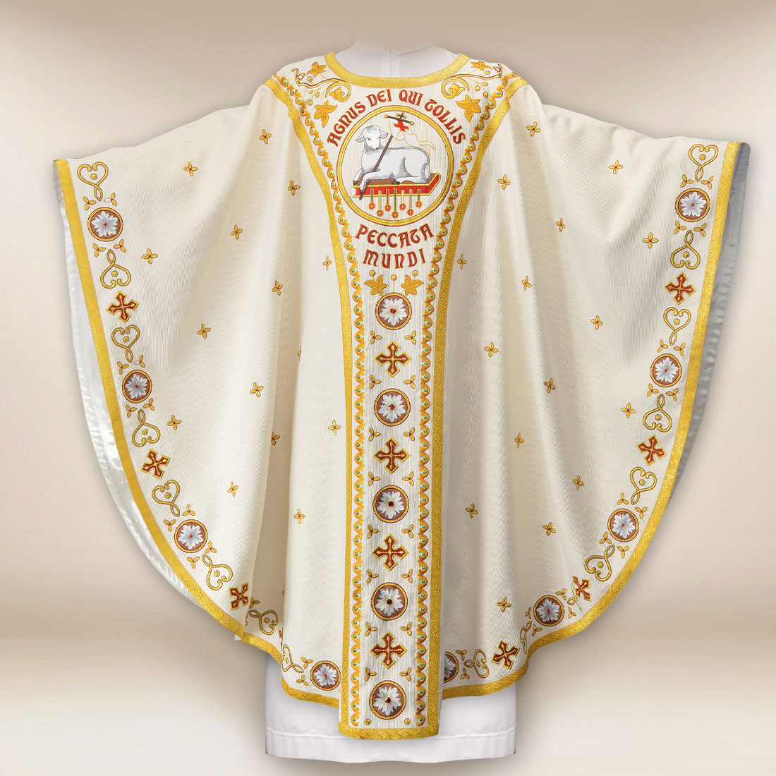 Casula ricamata Agnello di Dio premium è un paramento liturgico progettato per celebrazioni solenni, durante le quali la bellezza della simbologia eucaristica diventa particolarmente significativa. Casula ricamata Agnello di Dio premium si riferisce al motivo centrale – la rappresentazione classica dell’Agnello Pasquale, segno di Cristo che si offre in sacrificio per la salvezza del mondo.
