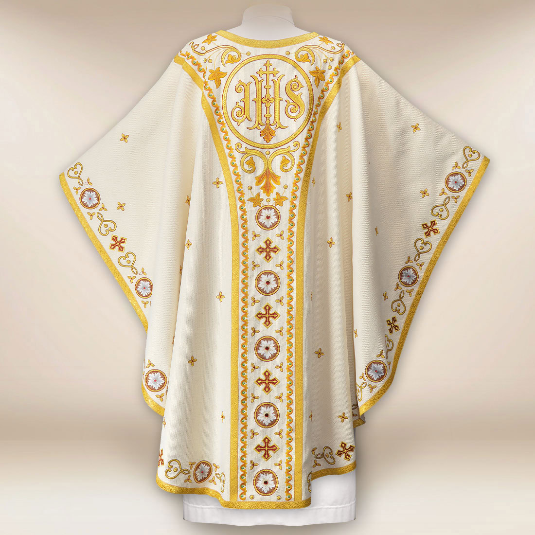 In dotazione c’è una stola interna coordinata, che crea un’armonia con la casula. Il paramento è particolarmente raccomandato per feste eucaristiche, processioni, Messe solenni e celebrazioni che richiedono un’eccezionale cornice liturgica.