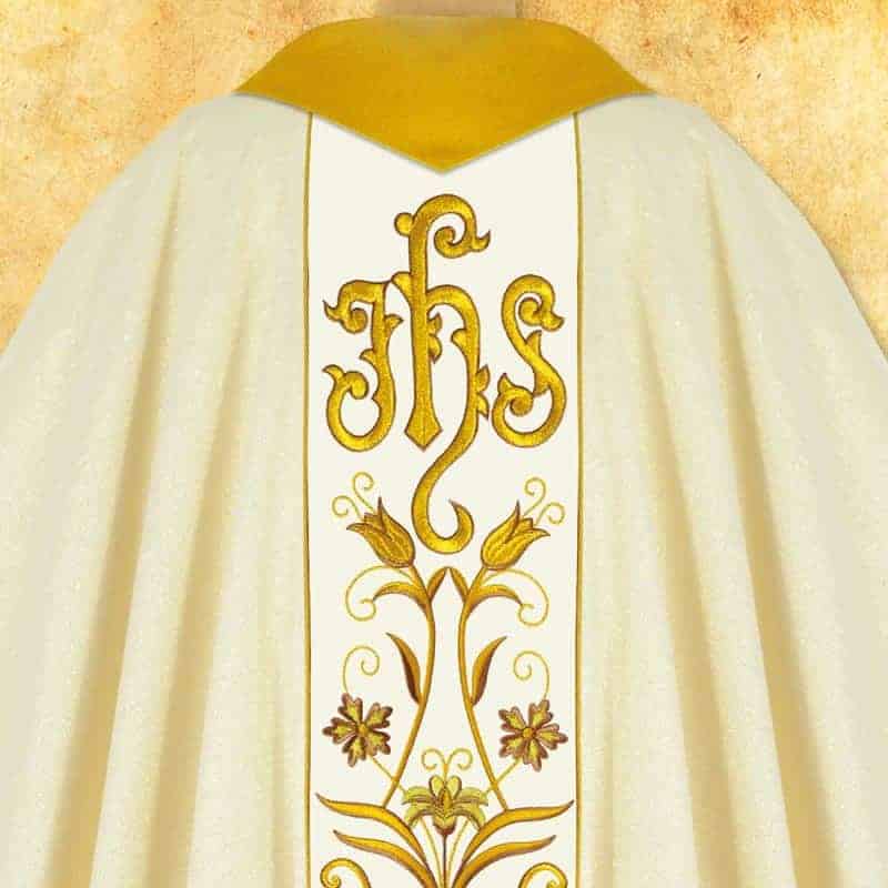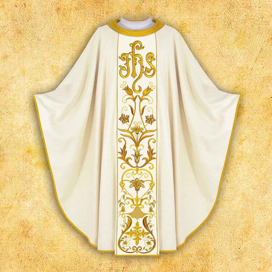 Gli ornamenti vegetali che circondano l’IHS introducono una dolce dinamica e sottolineano la dimensione spirituale della liturgia. La colorazione basata su tonalità ecru con accenti dorati assicura armonia visiva ed eleganza senza tempo. Il colletto dorato completa l’insieme e sottolinea il carattere rappresentativo del modello.