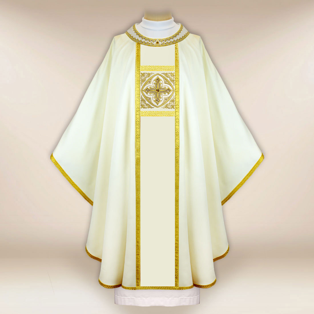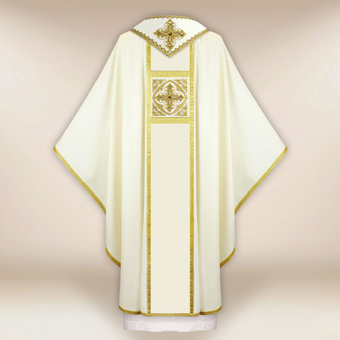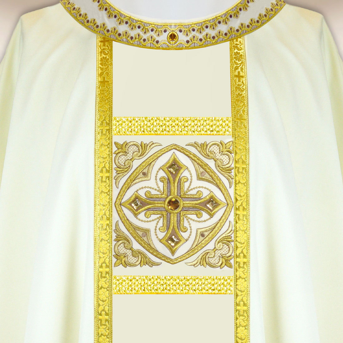 L’elemento decorativo centrale è un ricco ricamo realizzato con filo dorato, posizionato sul colletto, sul gallone e sulla stola interna coordinata. Gli ornamenti sono mantenuti in uno stile liturgico classico, e il filo dorato aggiunge luminosità ed eleganza, mantenendo al contempo sobrietà e un carattere nobile. La croce come motivo principale sottolinea il significato teologico della veste, inserendola nella tradizione della Chiesa e nella simbolica spirituale dell’Eucaristia.