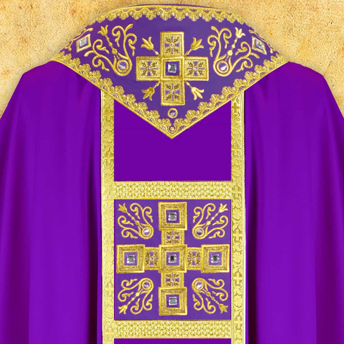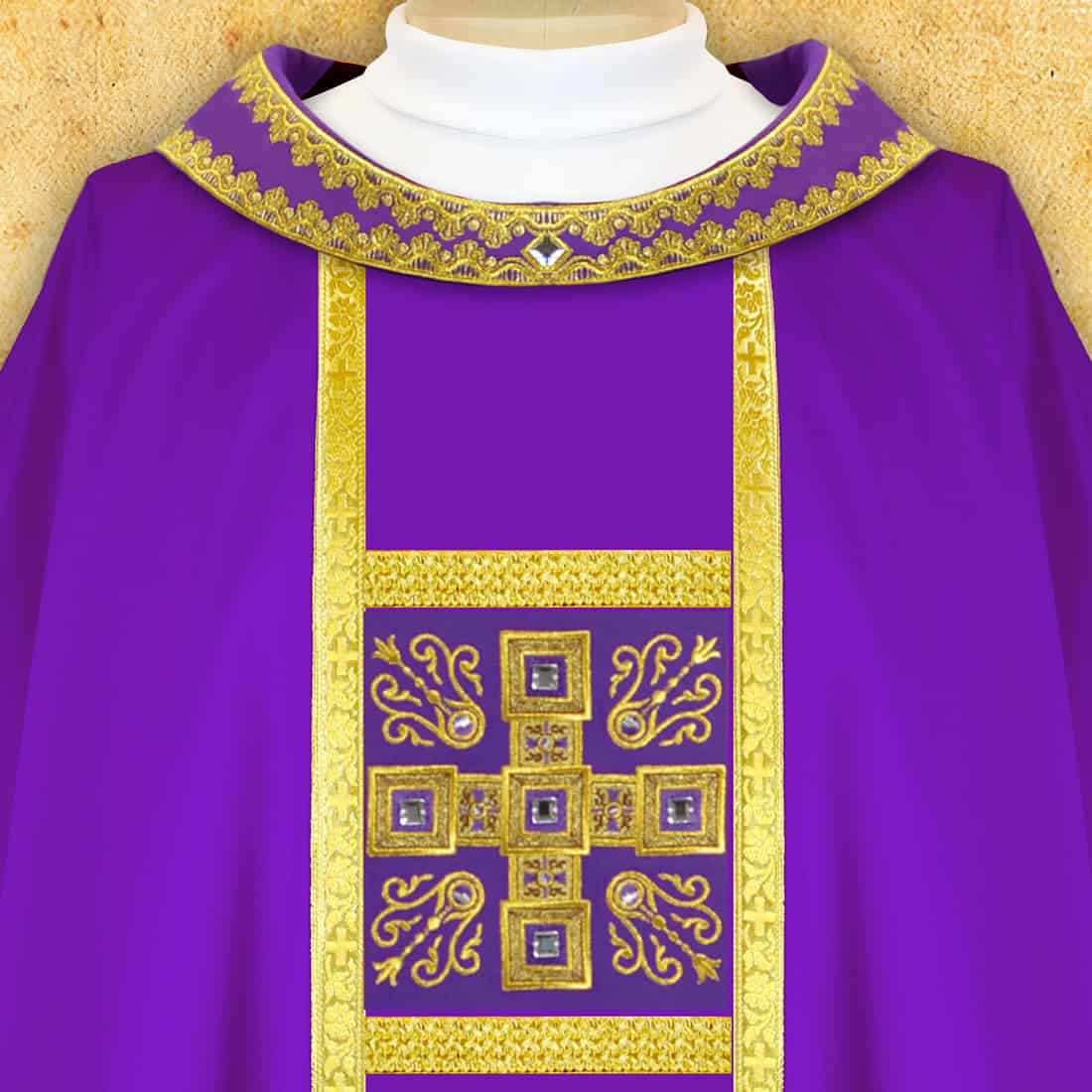 La casula liturgica presentata in questa offerta è un abito destinato alla celebrazione dei periodi di penitenza, concentrazione e riflessione spirituale. È realizzata in un tessuto liturgico di alta qualità, morbido e piacevole al tatto, che si adatta magnificamente durante la liturgia, mantenendo la sua forma anche dopo un uso prolungato. Il materiale è traspirante, leggermente lucido e resistente alle pieghe, permettendo così all’abito di presentarsi con dignità sia in movimento che in riposo.