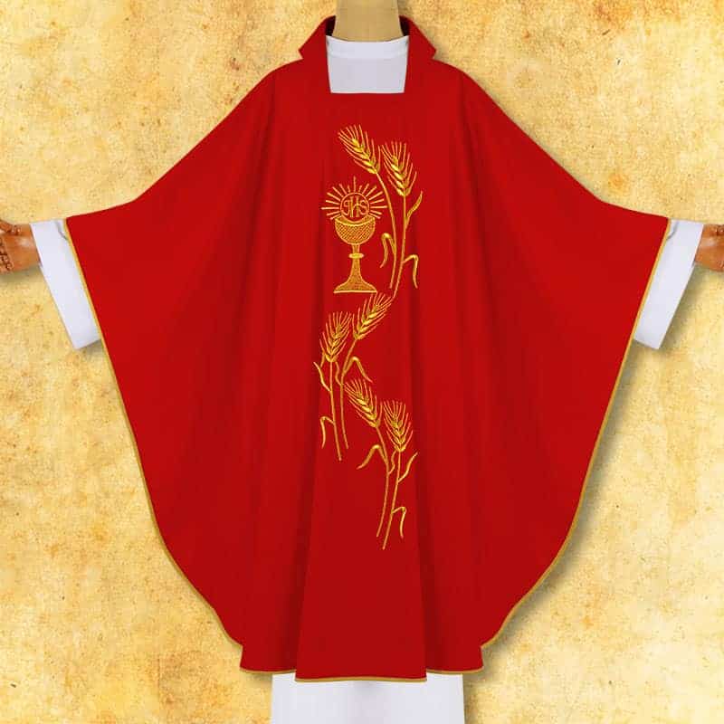 Casula ricamata Calice con Kłosami in versione rossa è un abito creato per le liturgie legate allo Spirito Santo, ai martiri e alle importanti celebrazioni ecclesiali. Il rosso sottolinea il fervore della fede e la disponibilità al sacrificio, mentre il calice ricamato insieme ai kłosami introduce una chiara simbologia eucaristica, ricordando il dono del Pane della Vita e la crescita spirituale della comunità della Chiesa.