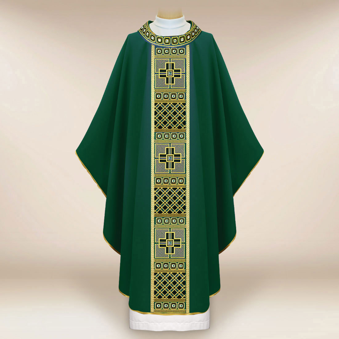 Casula liturgica verde ricamata è una proposta pensata per le celebrazioni del Tempo Ordinario, in cui il verde simboleggia la speranza, la crescita spirituale e la maturazione serena della fede. Il vestito è stato progettato per unire la sobrietà liturgica all’eleganza, mantenendo un equilibrio tra l’ornamentazione classica e il comfort pratico nell’uso.