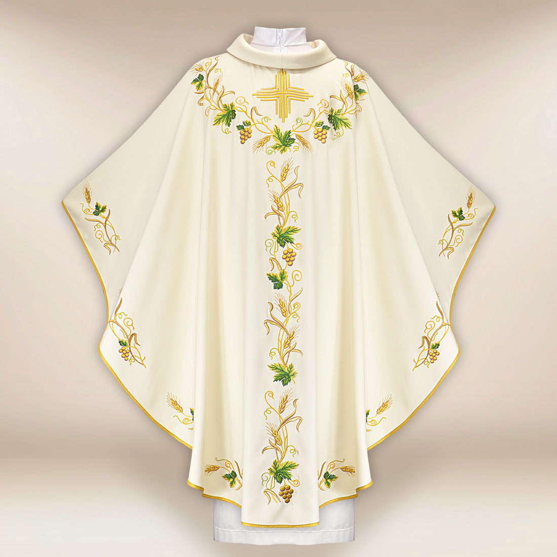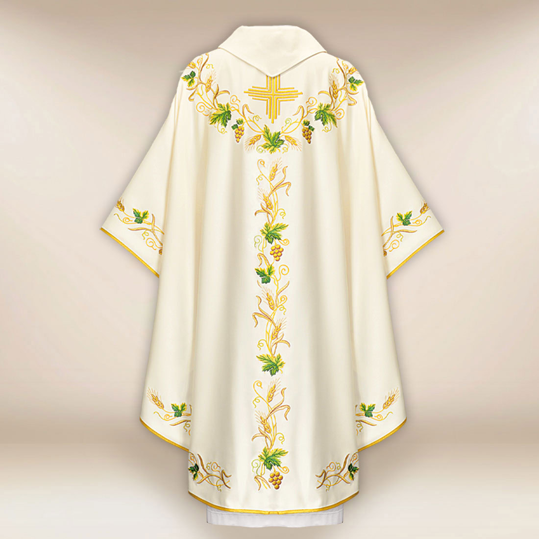 L’elemento decorativo principale è un ricamo dorato realizzato con precisione che rappresenta la croce e il motivo dei grappoli d’uva – simbolo eucaristico profondamente radicato nella tradizione della Chiesa. I delicati e accuratamente realizzati ornamenti aggiungono profondità e eleganza sacra all’abito. La ricca decorazione è espressiva, ma mantiene un equilibrio, non dominando la forma della casula, ma sottolineandola armoniosamente.