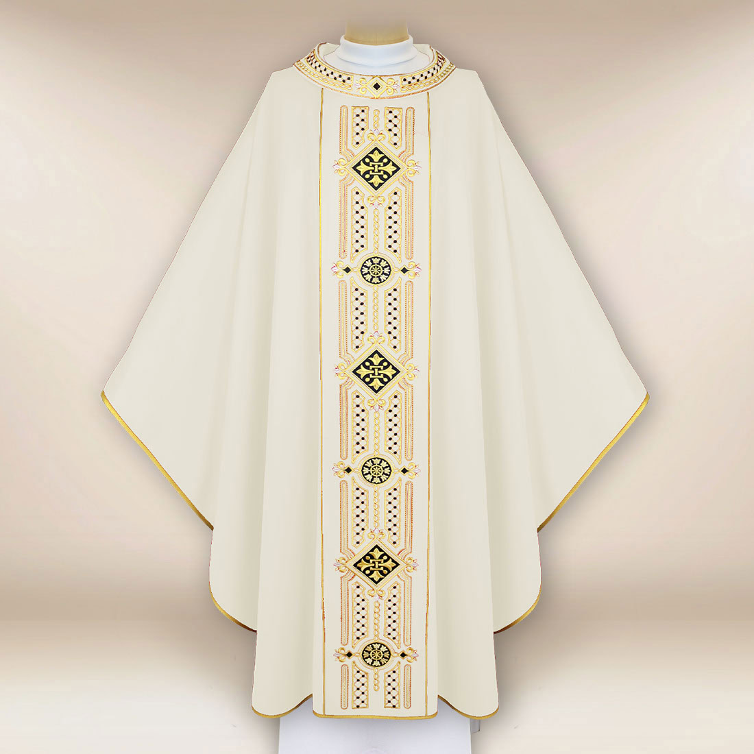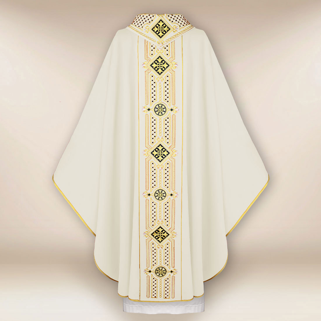L’ornamento centrale dell’abito è una fascia ricamata con filo d’oro, che corre dal colletto fino al bordo inferiore. L’ornamento è composto da motivi geometrici e vegetali, ispirati all’arte sacra classica. Grazie a ciò, la composizione è nobile, coerente e bilanciata, e le sue proporzioni evidenziano la linea verticale della casula, conferendole leggerezza. Il colletto ricamato completa il tutto, creando con la fascia un insieme armonioso che si presenta elegantemente sia da vicino che nello spazio del presbiterio.