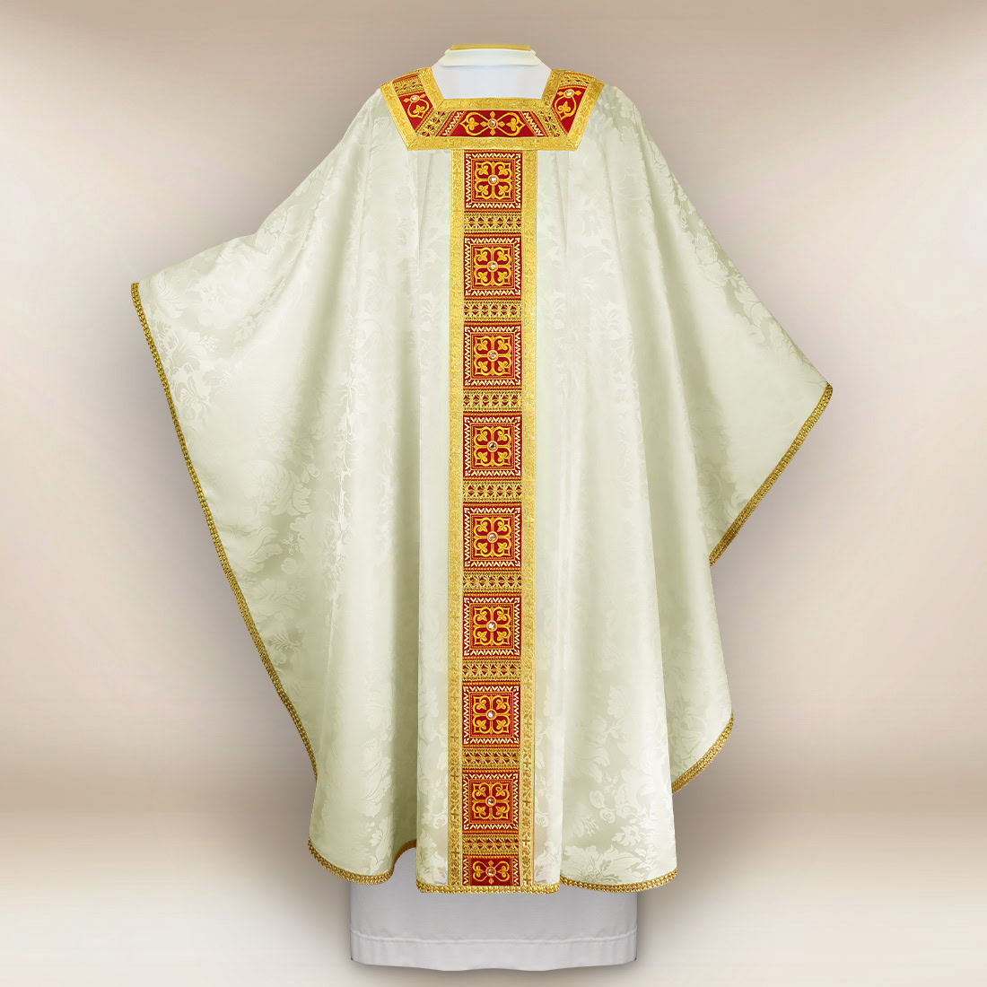 La veste è realizzata in tessuto jacquard di alta qualità con una tonalità luminosa, che riflette delicatamente la luce e conferisce un’eleganza unica. Il delicato intreccio floreale del materiale crea un effetto di profondità, rimanendo al contempo conforme al canone classico delle vesti liturgiche. La combinazione di fibre naturali e sintetiche rende la casula morbida, durevole e perfettamente modellabile durante il movimento, il che è particolarmente importante durante lunghe celebrazioni e processioni.