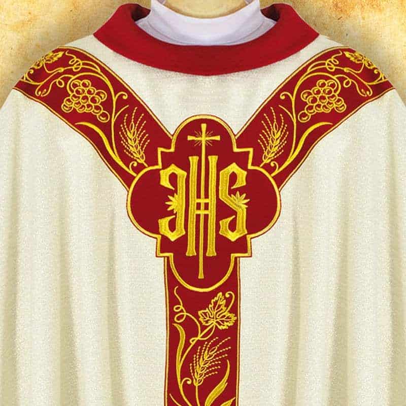 La casula è decorata con un’applicazione ricamata IHS – simbolo del nome di Gesù Cristo, esprimente fede e devozione.
