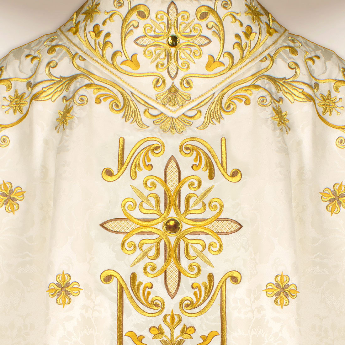 Il tessuto è morbido e piacevole al tatto, e grazie alla sua struttura, la casula si adatta perfettamente alla silhouette, garantendo comfort durante le celebrazioni liturgiche. Gli ornamenti dorati distribuiti su tutta la superficie della veste aggiungono luminosità e sottolineano il carattere solenne delle celebrazioni ecclesiali.