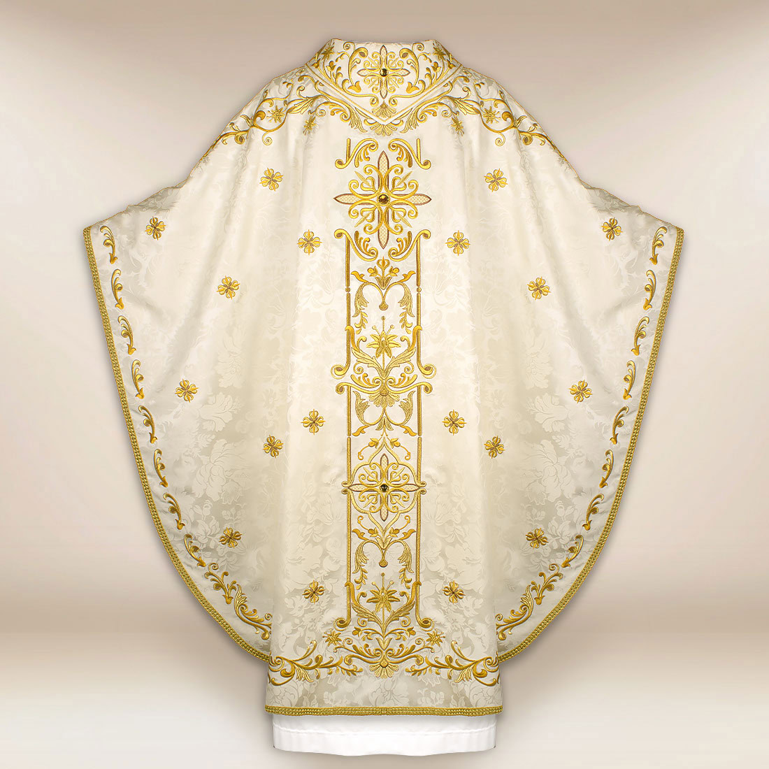 Casula ricamata con immagine di san Giuseppe, realizzata in tessuto di alta qualità decorato con un delicato motivo vegetale jacquard, che conferisce all’insieme un’eleganza straordinaria e un’espressione sacra. Il pannello centrale della casula è adornato da un’immagine ricamata di san Giuseppe, patrono delle famiglie, della Chiesa e dei lavoratori. La composizione del ricamo è stata elaborata con attenzione a ogni dettaglio – dalle proporzioni naturali della figura ai sottili ornamenti dorati, che si armonizzano perfettamente con lo sfondo.