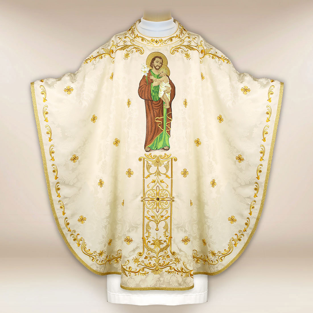 Elegante casula ecru decorata con immagine ricamata di san Giuseppe e ornamenti dorati.