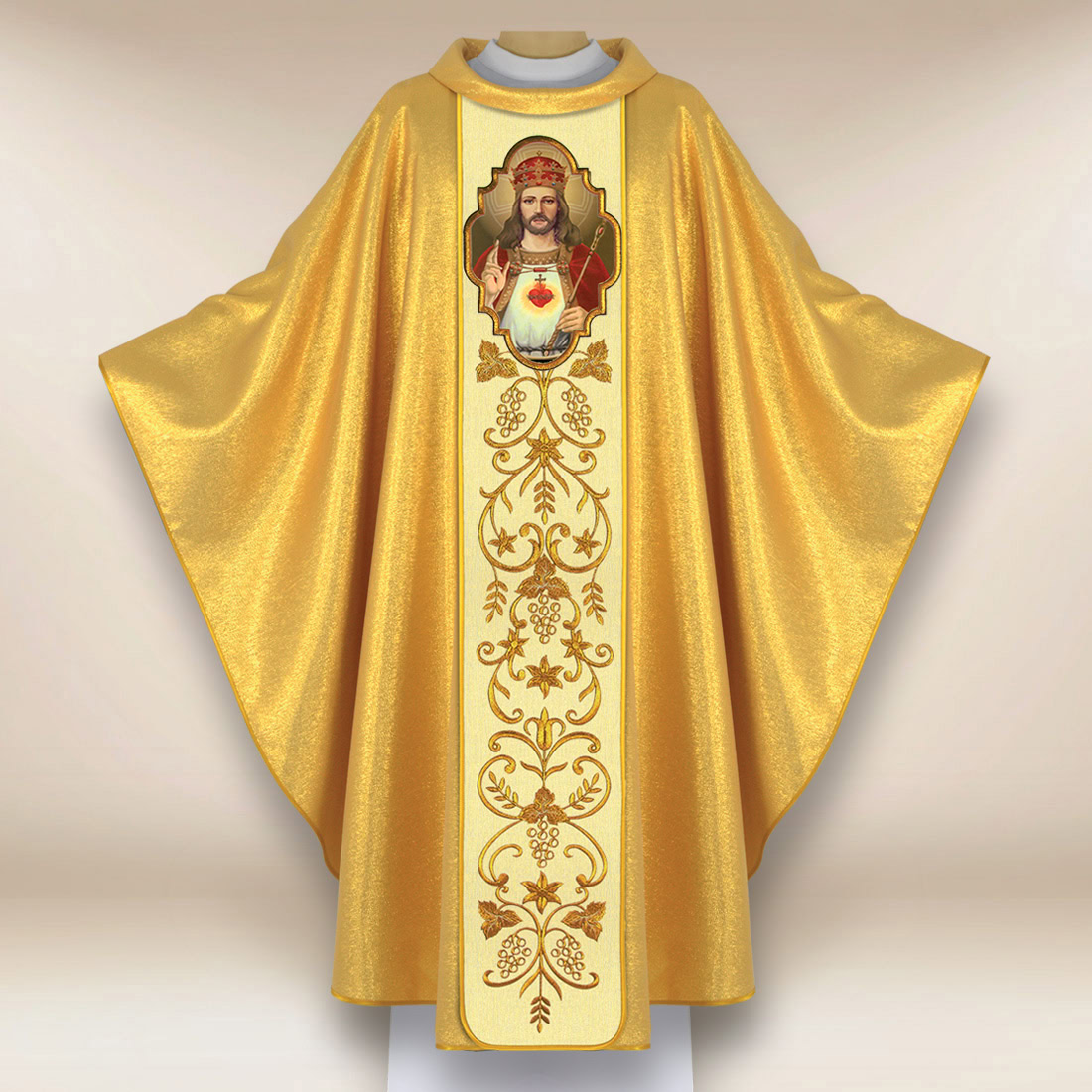 Casula solenne di colore dorato con immagine di Cristo Re e ricco ricamo.